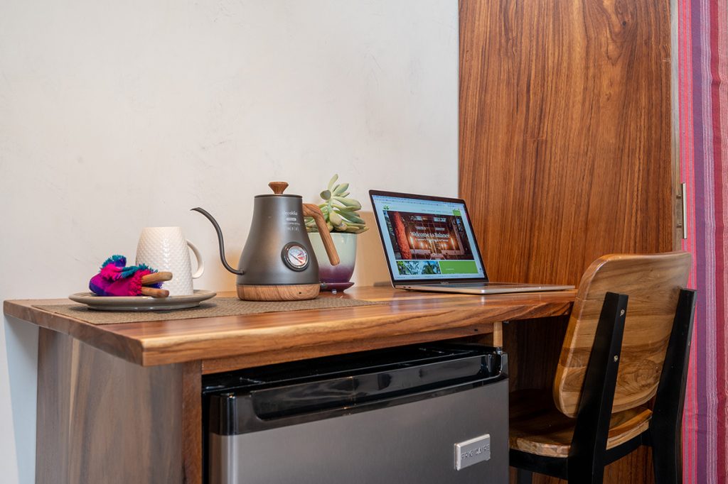 The Jacaranda Suite is located adjacent to, but separate from our Villa, and located next to our Jacaranda tree. This room comes with 1 queen bed, a private bathroom, and a private terrace. This room comes with a small kitchenette with a mini fridge and a tea kettle, high-speed fiber optic internet, a closet / organizer, a secure safe, and a small desk/workstation. All rooms at Balancé come with hot water showers, premium linens, and air conditioning, and come stocked with purified drinking water that we keep refilled throughout your stay.  Please bring a refillable water bottle such as a hydro flask or Nalgene.